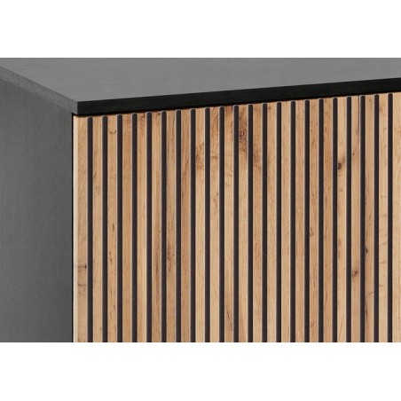 Witryna Bento SZ104 to wyrafinowany i nowoczesny mebel, który zachwyci każde wnętrze. Dzięki korpusowi wykonanemu z wysokiej jakości płyty laminowanej oraz frontom z płyt MDF, komoda emanuje naturalnym urokiem i przytulnością. Charakterystyczne lamelki dodają meblowi lekkości i subtelności. Połączenie czerni z odcieniem dębu nadaje komodzie wyjątkowego kontrastu, sprawiając, że pasuje zarówno do klasycznych, jak i nowoczesnych aranżacji.
