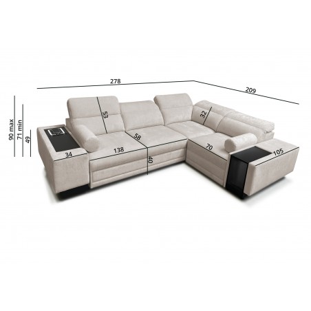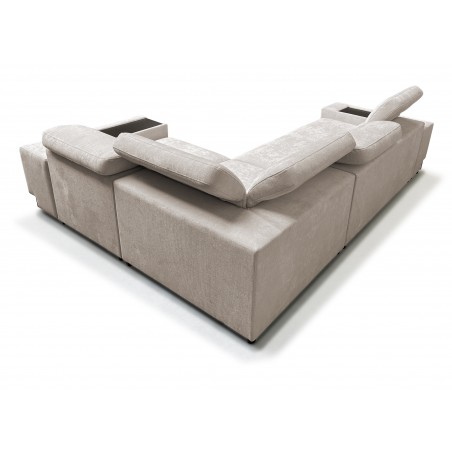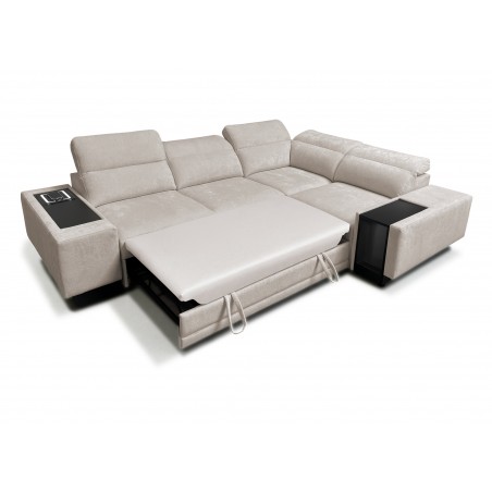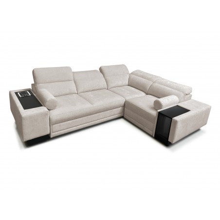 Narożnik został wyposażony w praktyczny, otwierany barek z wnęką, idealny do przechowywania podręcznych przedmiotów.