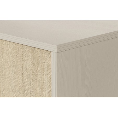 Fronty w dekorze Jodełki Scandi zdobią trójkątne uchwyty w kolorze złotym naszego projektu.