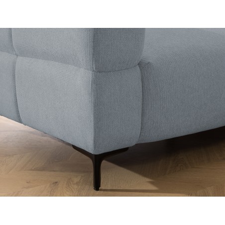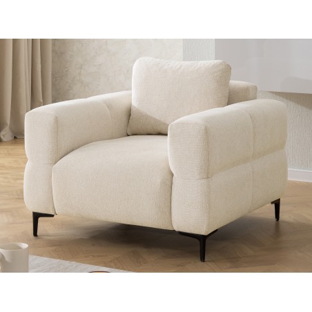 Fotel stoi na smukłych, czarnych metalowych nogach. To fajny kontrast do jasnej, ciężkiej bryły — dzięki temu mebel wygląda lżej i nowocześniej, a nie topornie.