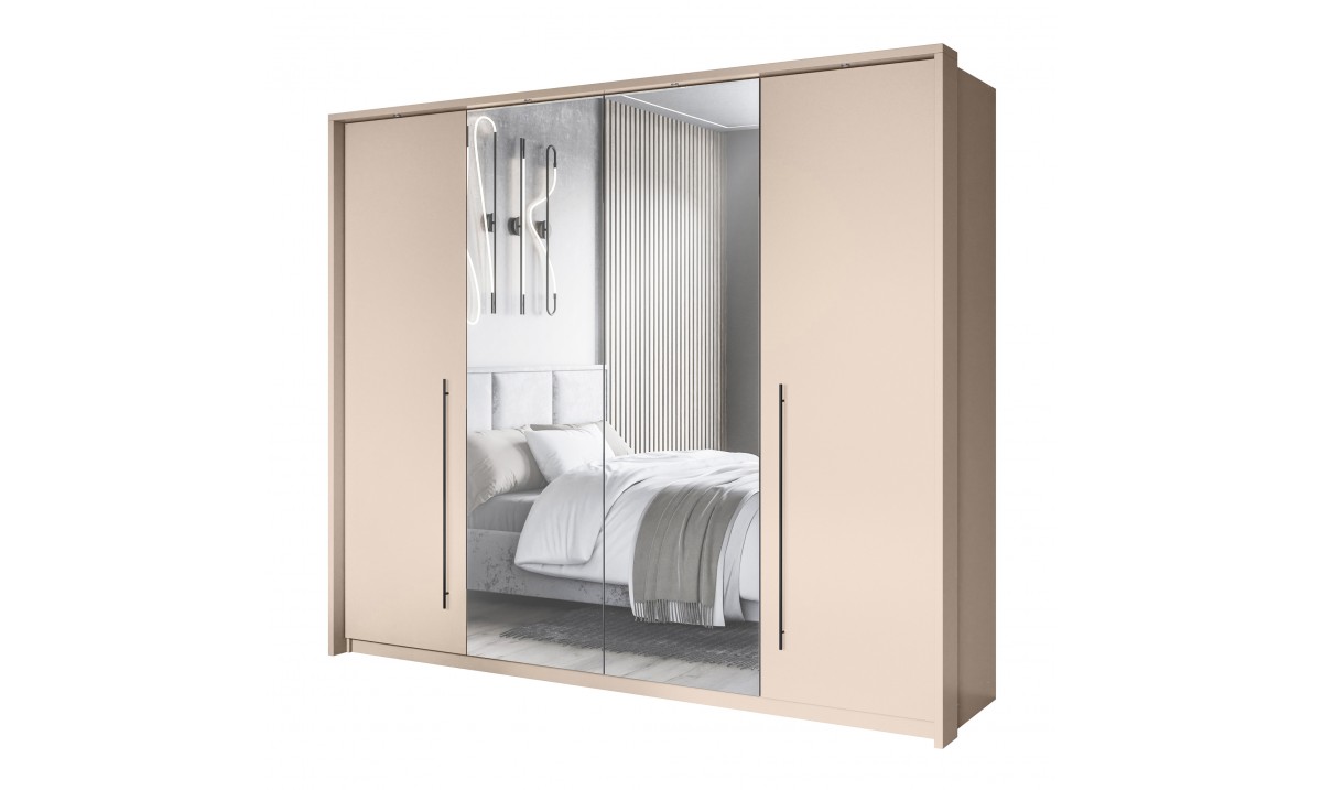SAVANA 250 to przestronna szafa przesuwna, która łączy minimalistyczny design z imponującą pojemnością. Jej elegancka forma i ciepła kolorystyka w odcieniu beżu piaskowego z lustrzanymi frontami doskonale wpisuje się zarówno w nowoczesne, jak i klasyczne wnętrza.