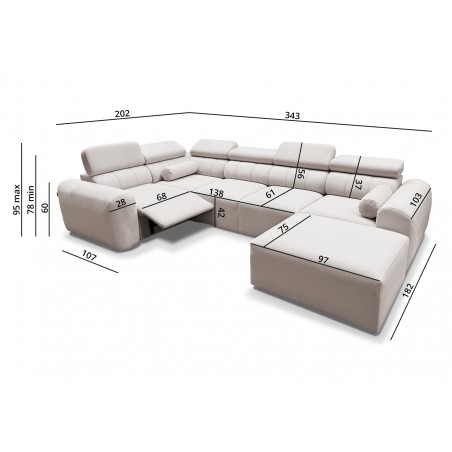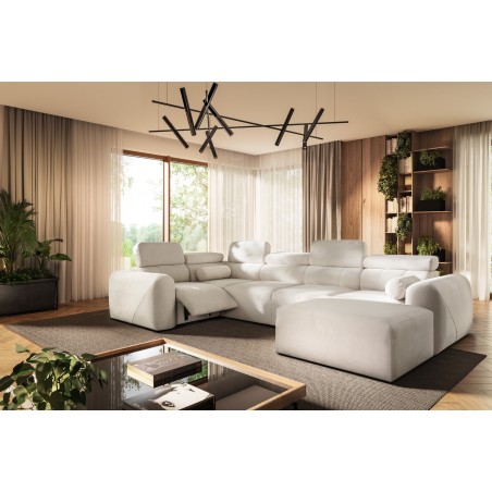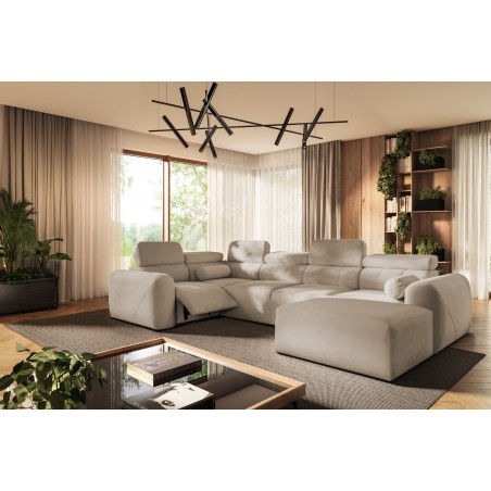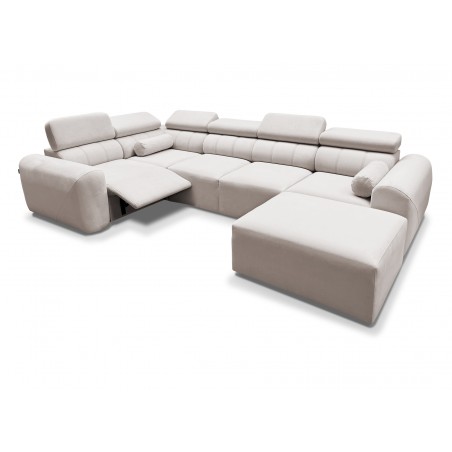 Model posiada również elektrycznie wysuwany podnóżek, który umożliwia komfortowe ułożenie nóg i zapewnia relaks na najwyższym poziomie – jednym przyciskiem można zmienić narożnik w strefę wypoczynku typu home cinema.